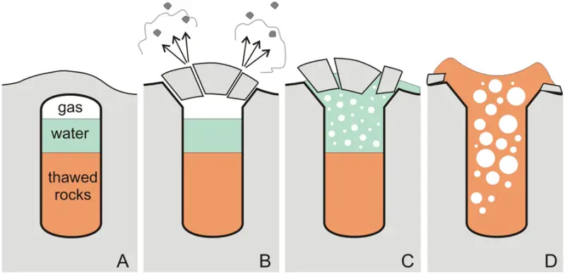 Скорее всего, все происходит так: под вечной мерзлотой образуется и скапливается природный газ, а климат меняется, и из-за этого ледяная «крышка» сверху становится тоньше и слабее