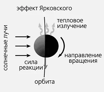 Другой, куда более коварный механизм — это эффект Ярковского. Он связан с тем, что астероид поглощает солнечное тепло на дневной стороне и переизлучает его на ночной.