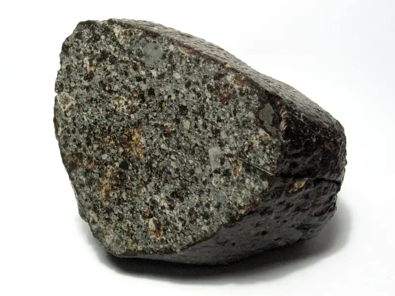 Образец метеорита NWA 869 весом 700 г. На срезе и полированной поверхности этого видны хондры и металлические чешуйки