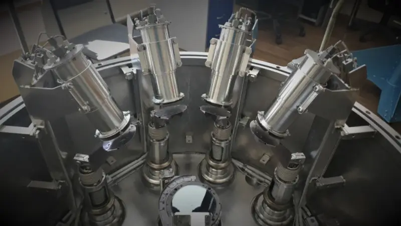 Внутри установки: четыре молекулярных источника и подложка