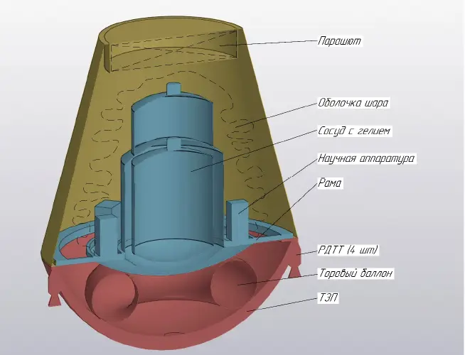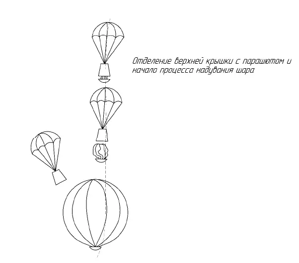 Но это будет лишь предварительный этап. На 3103 секунде полета, на высоте 58 км, произойдет кульминация: отстрел парашюта и верхней крышки. В этот момент из специального торового баллона, прикрепленного к нижней части аппарата, в сложенную оболочку аэростата начинает поступать гелий. Всего за 96 секунд шар наполняется. К моменту достижения высоты 50 км он уже готов к полету.