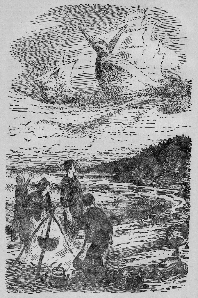 Греясь у костра, мы пили чай. Вдруг Чжан-Бао что-то закричал. Я обернулся и увидел мираж. В воздухе, немного выше поверхности воды, виднелся пароход, две парусные шхуны, а за ними горы, потом появилась постройка, совершенно не похожая ни на русский дом, ни на китайскую фанзу. Явление продолжалось несколько минут, затем оно начало блекнуть и мало-помалу рассеялось в воздухе