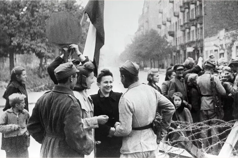 На улицах освобожденной Варшавы жители встречают советских солдат и бойцов Армии Крайова. 1944 год
