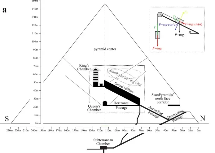 Новая модель, которую предложил американский исследователь Саймон Шойринг, отказывается от идеи внешних пандусов и обращает внимание на внутреннюю структуру пирамиды. Ключевая идея заключается в том, что уже существующие наклонные проходы (Восходящий коридор и Большая галерея) служили не для людей, а для тяжелых противовесов. Их идеально гладкий пол под углом 26,5 градуса (1 локоть подъема на 2 локтя длины) — это готовые направляющие для спуска саней с грузом.