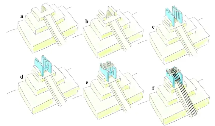 Пирамида в пирамиде: Если убрать внешнюю облицовку, видно, что внутренняя кладка растет не ровными слоями, а отдельными высокими «ступенями». Это очень похоже на ярусы строительных лесов или уровни, с которых велась укладка камня. Каждый новый ярус означал, что подъемные механизмы перенесли выше.