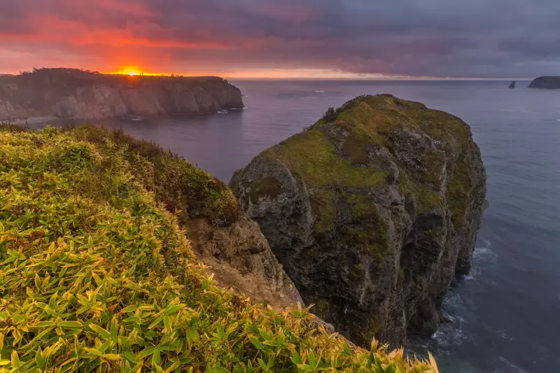 В свою очередь, Шикотан, крупнейший остров Малой Курильской гряды, выступает над водой частью невулканической дуги и является своеобразным форпостом этой вечной битвы стихий. Последняя катастрофа случилась здесь не так давно, 4 октября 1994 года. Тогда землетрясение магнитудой 8.3 заставило остров погрузиться в море на 0.6 метра, унеся жизни людей и оставив после себя руины.