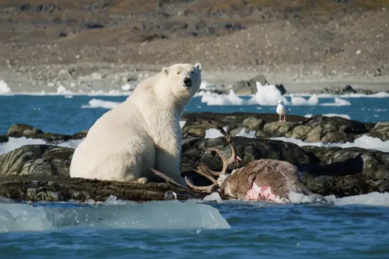 Еще одна прибавка к рациону — это северные олени. Их на Шпицбергене с каждым годом становится все больше и больше, и медведи начали целенаправленно охотиться на этих копытных.