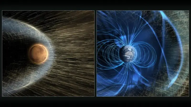 У Марсе нет магнитного поля, как у Земли, следовательно, отсутствует защита от радиации