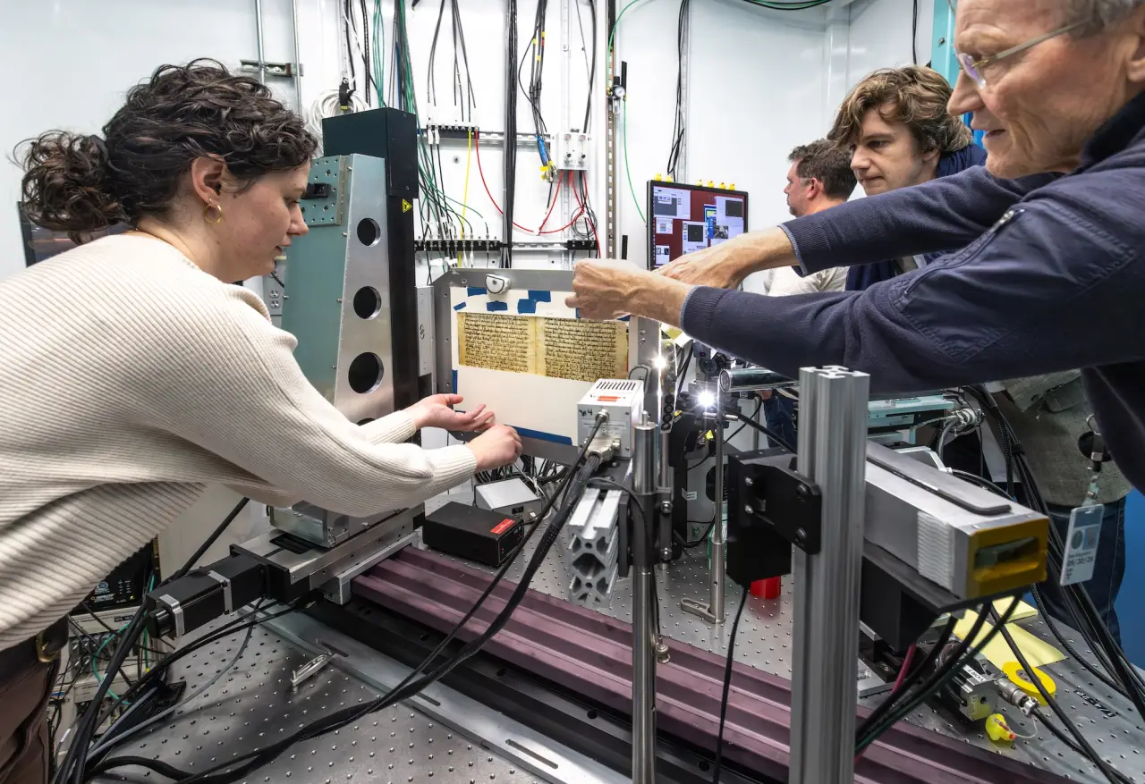 Слева направо: реставратор Элизабет Хейслетт, ученый Виктор Гисемберг и физик Уве Бергманн помещают страницу рукописи в сканирующий аппарат в Национальной ускорительной лаборатории SLAC 21 января 2026 года