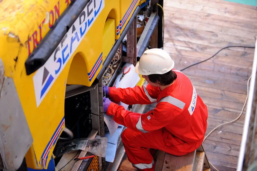 Техник осматривает дистанционно управляемый подводный аппарат на Seabed Worker. Скоро он будет таскать серебряные слитки с чудовищной глубины