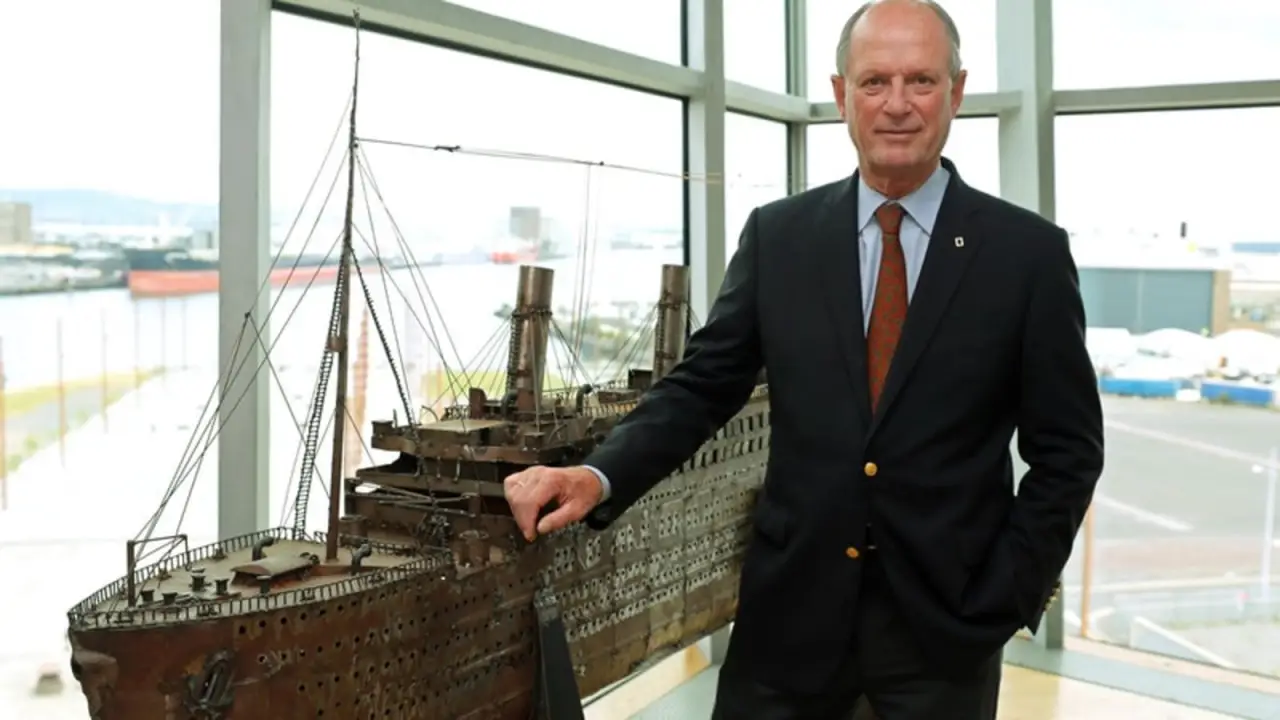 Роберт Баллард рядом с моделью «Титаника»