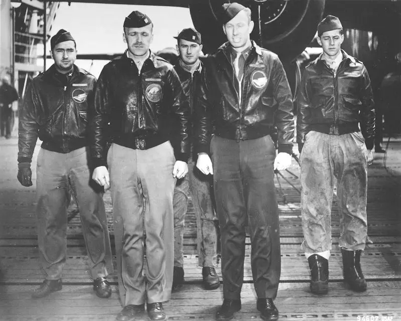 Капитан Эдвард Дж. Йорк, пилот; лейтенант Роберт Г. Эмменс, второй пилот; лейтенант Нолан А. Херндон, штурман/бомбардир; старший сержант Теодор Х. Лабан, бортинженер; сержант Дэвид У. Пол, стрелок. (Фото ВВС США)